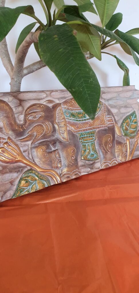Fa falikép – kézzel faragott elefánt motívummal (50x20 cm) Ez az egyedi, kézzel faragott fa falikép a balinéz kézművesség különleges példája, amelyben a hagyományos motívumok és a természetes anyagok harmonikus egységben jelennek meg. A 50x20 cm méretű tábla tömör fából készült, felületét egy részletgazdag elefánt motívum díszíti, melyet autentikus bali minták egészítenek ki. A faragás finoman kidolgozott, a domináns zöld és arany színek elegáns kontrasztot alkotnak, és még jobban kiemelik a műalkotás mélységét és karakterét. Ez a falikép nemcsak egy dísztárgy, hanem egy időtálló, kulturális értéket hordozó alkotás, amely melegséget és egyediséget visz bármely térbe – legyen az otthon, iroda