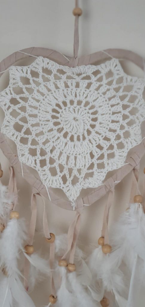 A makramé technika a csomózás és a fonás művészete, amely különleges textúrával és részletes mintákkal díszíti az álomfogót, egy olyan finomságot adva neki, amely a szemlélőt azonnal magával ragadja.