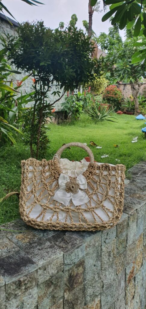 Kézműves balinéz női nyári táska tengerfűből – fehér béléssel és virágdísszel Ez a különleges, kézzel készült nyári táska Bali szigetének hagyományos kézműves technikáit hordozza magában. Természetes tengerfűből fonva készül, amely könnyű, mégis tartós alapot biztosít, miközben a trópusi hangulatot is magán viseli. A táska belsejét puha, fehér textilbélés borítja, amely nemcsak esztétikus, hanem praktikus is: megóvja a tartalmát és kényelmessé teszi a mindennapi használatot. A külső részén elhelyezett finom, kézzel készített virágdísz egyedi, nőies megjelenést kölcsönöz, így minden outfithez friss, nyári stílust ad. Ideális választás: nyári sétákhoz, tengerpartra vagy városi programokra boho, természetes stílus kedvelőinek, ajándéknak, hiszen különleges, egzotikus és