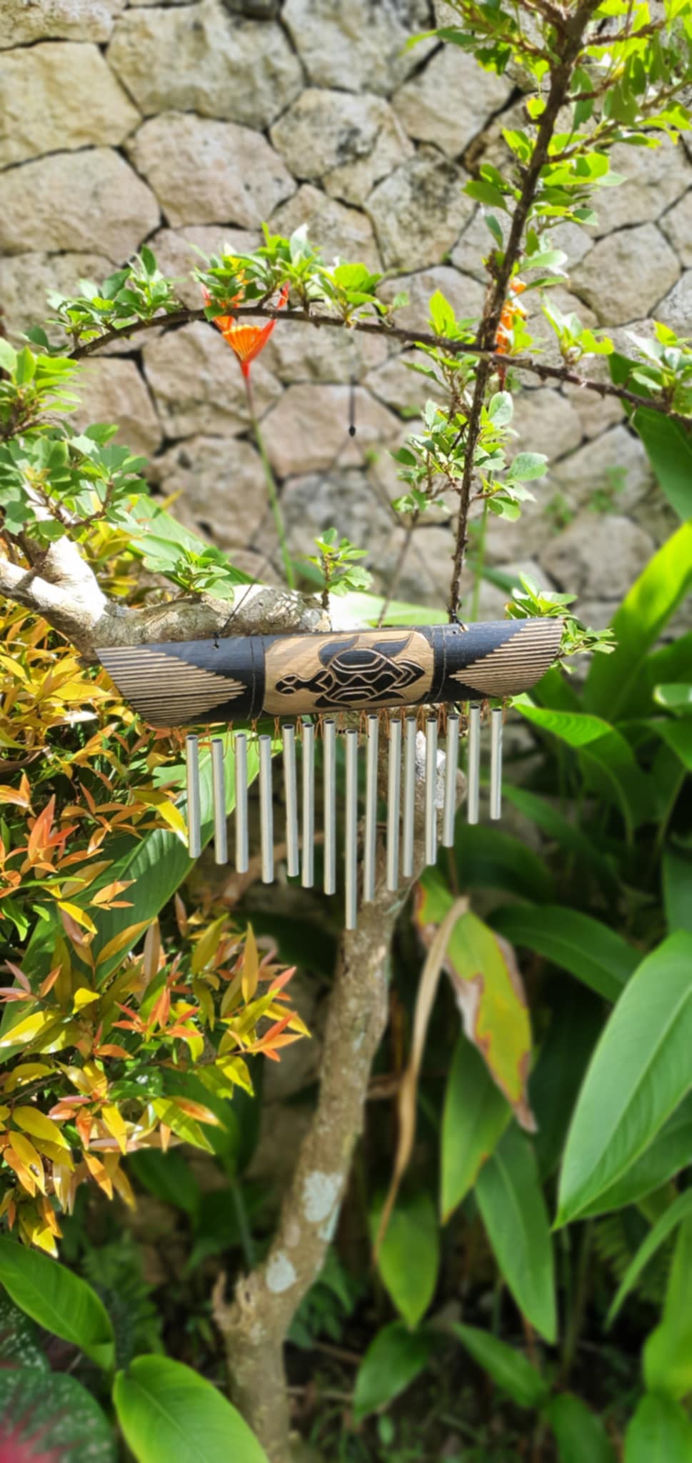 Ez a művészien megmunkált szélcsengő a természetes anyagok és a balinéz kézművesség harmóniáját egyesíti.
